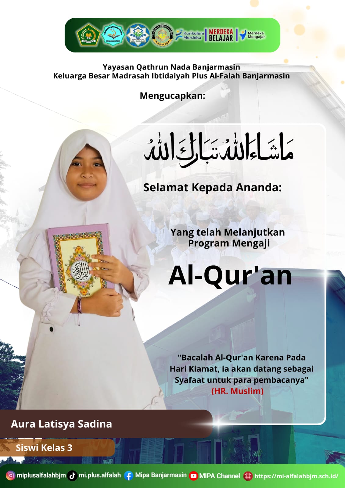 Suasana Jumat Taqwa hari ini terasa berkah dan istimewa dengan adanya kabar gembira. Siswi Aura Latisya Sadina dari MI Plus Al-Falah diumumkan telah berhasil menyelesaikan program belajar membaca Al-Qur’an dengan metode IQRA’ dan secara resmi melanjutkan program ngaji ke tingkatan Al-Qur’an.