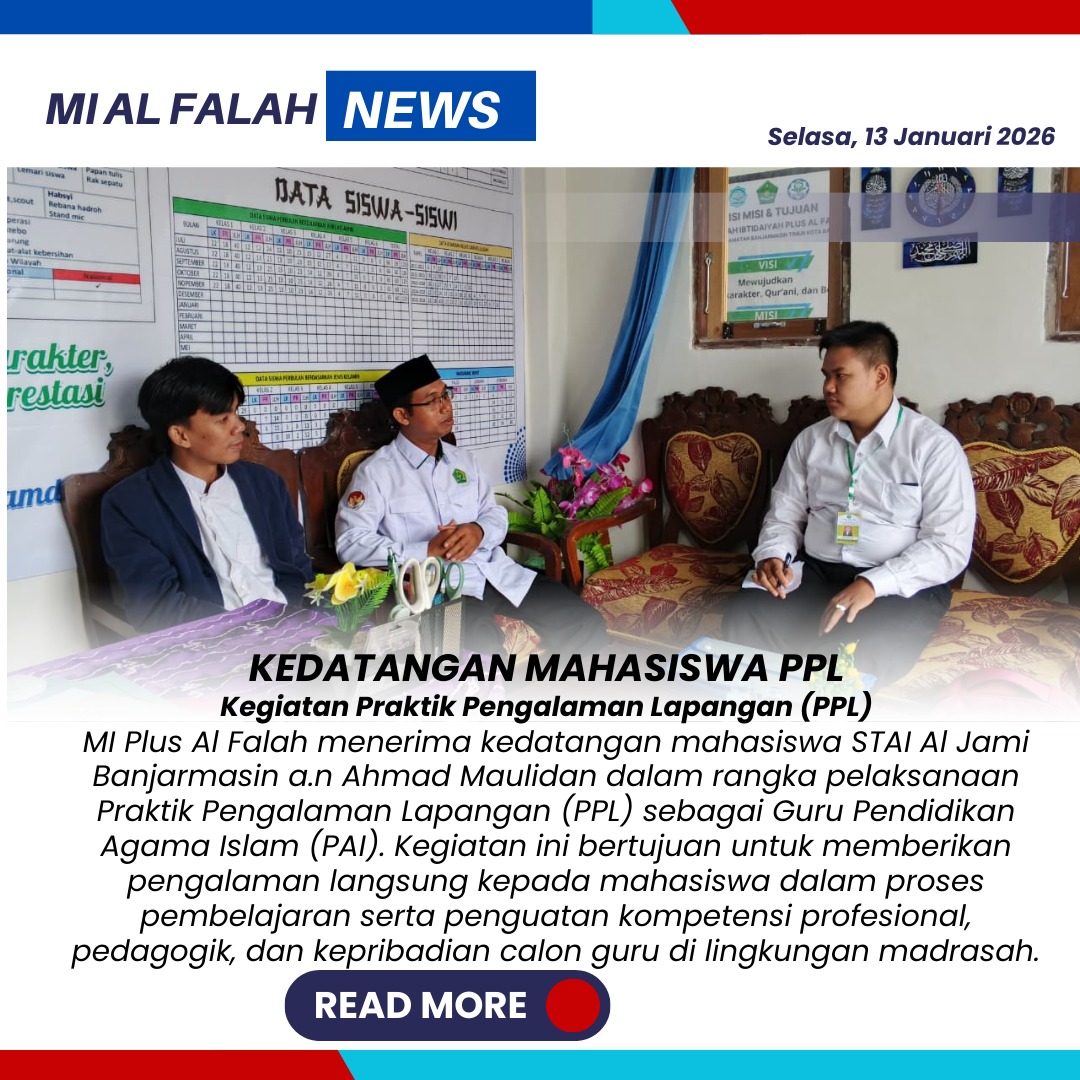 Banjarmasin, 13 Januari 2026 – Dalam upaya mendukung pengembangan kompetensi calon pendidik, MI Plus Al-Falah Banjarmasin secara resmi menyambut kedatangan mahasiswa untuk melaksanakan kegiatan Praktik Pengalaman Lapangan (PPL) pada Selasa (13/1).